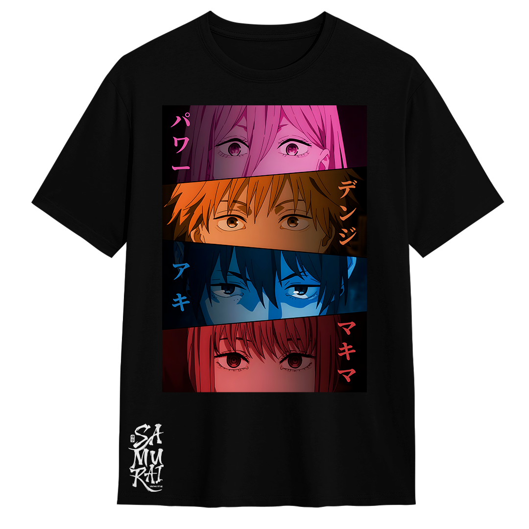 La Camisa Chainsaw Man Mirada División Especial 4 refleja a Denji, Power, Aki y Makima en su pose más icónica: una mirada llena de coraje y determinación frente a los demonios. Este diseño detallado transmite la energía, el trabajo en equipo y la tensión de los enfrentamientos más peligrosos del anime. Perfecta para los fanáticos que buscan un estilo audaz y cargado de acción.
