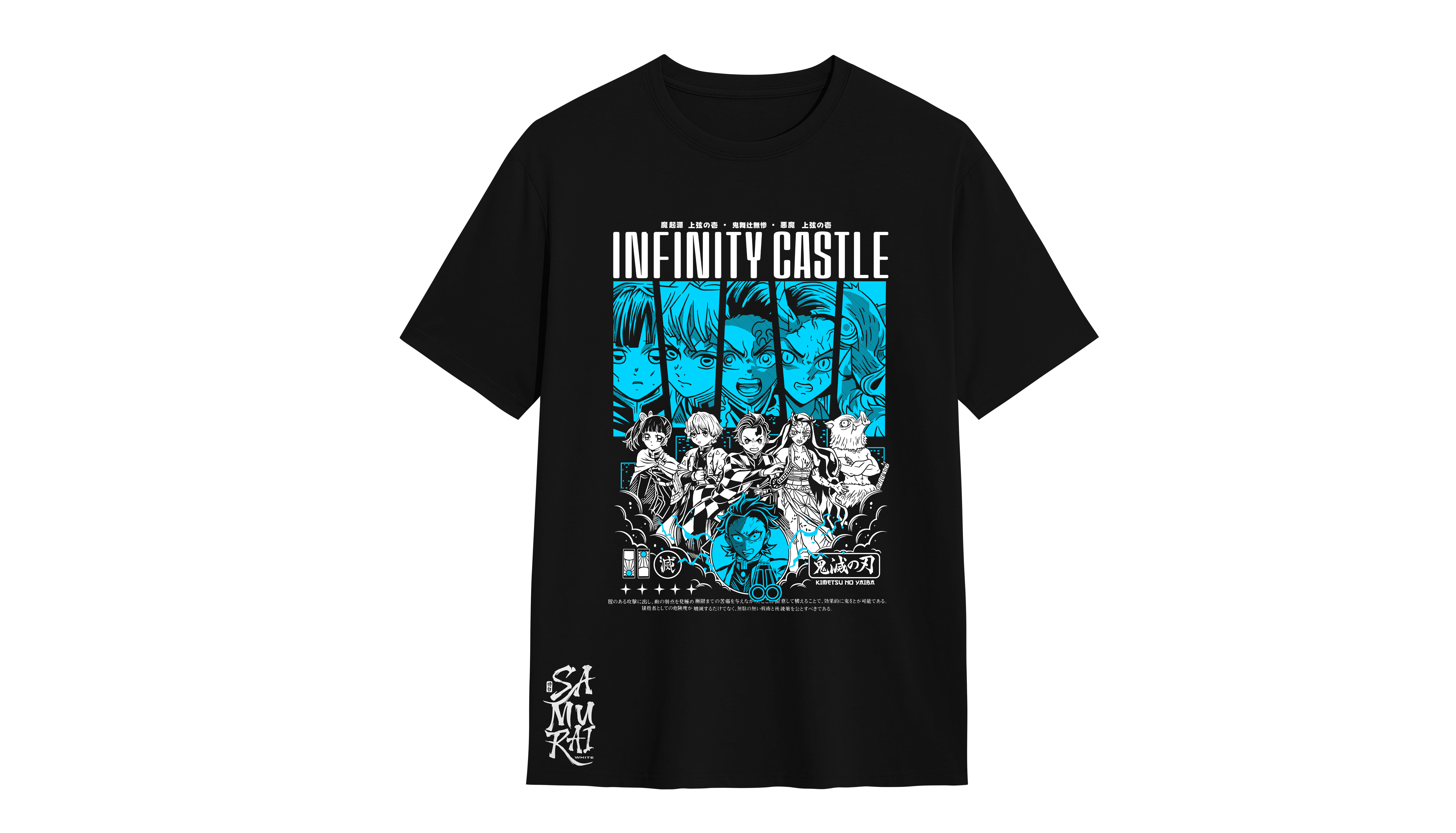 🌌 Adéntrate en las profundidades del Castillo Infinito con esta camisa de Demon Slayer: Kimetsu no Yaiba. El diseño, bañado en tonos azules intensos, captura la tensión palpable del arco final mientras Tanjiro, Nezuko y sus valientes compañeros se preparan para enfrentar lo desconocido